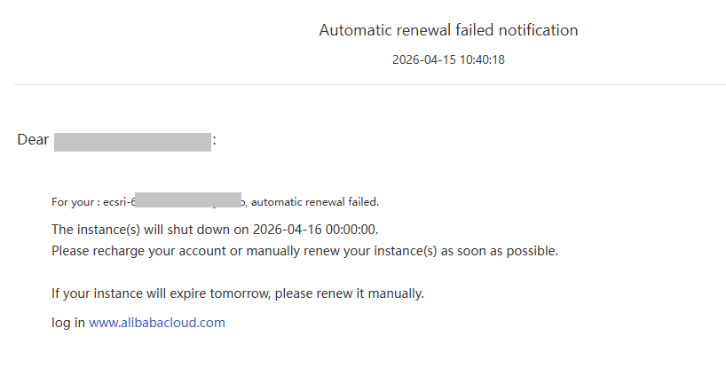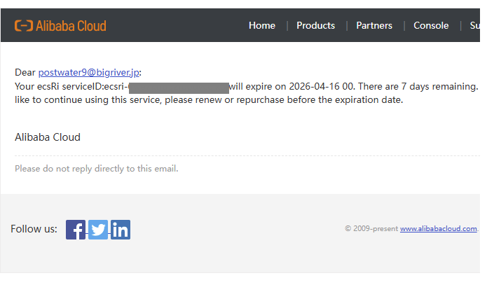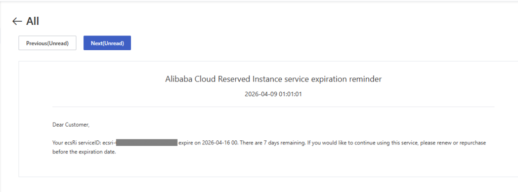 あたりまえですが更新期限の前に Alibaba Cloud から通知が来ます。 メールやコンソールの通知です。 私の環境は1つしか Reserved Instance がありませんが、これが企業だと数百、数千あったり、購入タイミングがバラバラだと事前の予算管理も含めてきちんとやらないと更新漏れだったり、予算確保漏れが起きてしまったりしますよね。