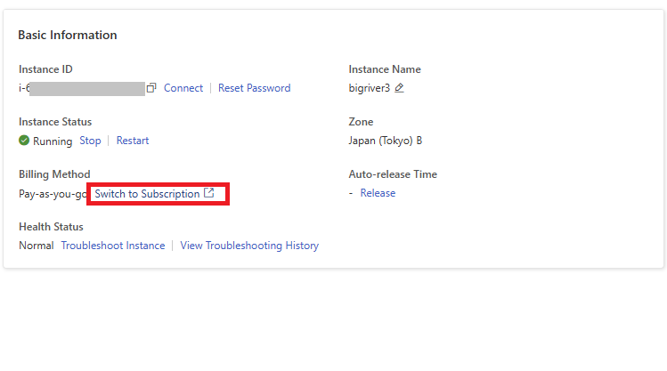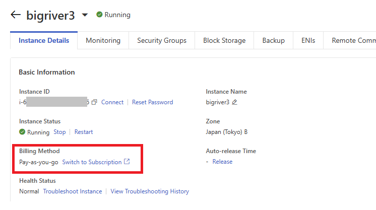 コンソールからインスタンスの情報を確認すると Billing Method は Pay-as-you-go のままです(ままと言っているのは Reserved Instance の適用対象とするには Pay-as-you-go である必要があるため)