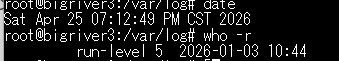 本当にECSの仮想マシンのインスタンスが停止されていないか確認します。 今日は4月25日、Reserved Instance が終了したのが4月16日です。 以下、who -r コマンドでシステムの稼働日は2026年1月3日から稼働中であること、停止していないことがわかります。